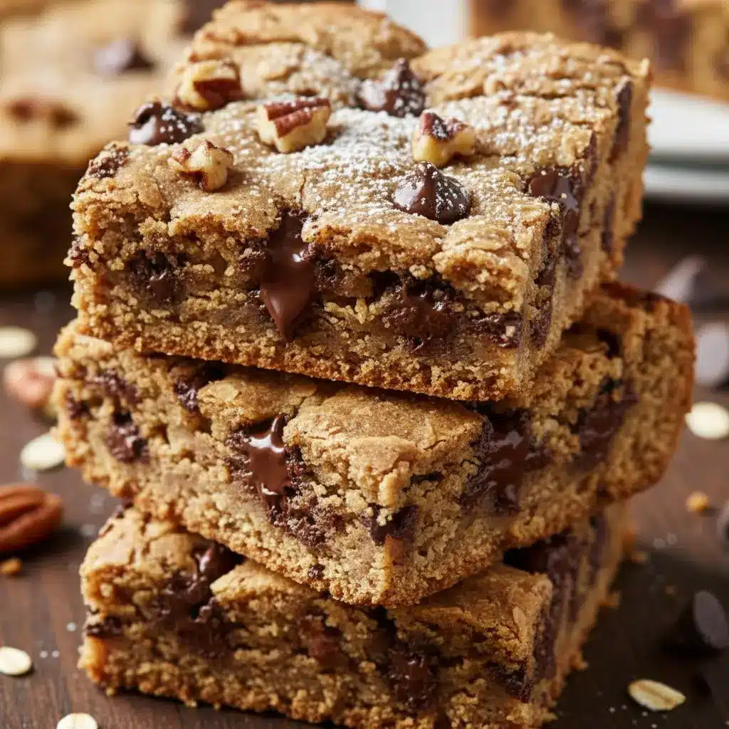 A soft and chewy gluten-free dessert bar made with oat flour, lightly sweetened with maple syrup and packed with chocolate chips for a wholesome treat.