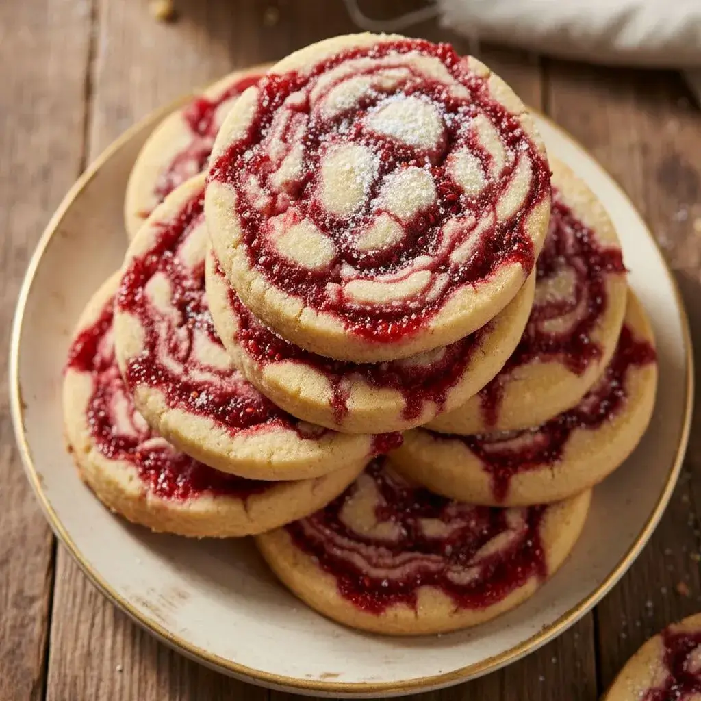 Tender, buttery shortbread cookies swirled with a vibrant raspberry jam for a beautiful and delicious treat.